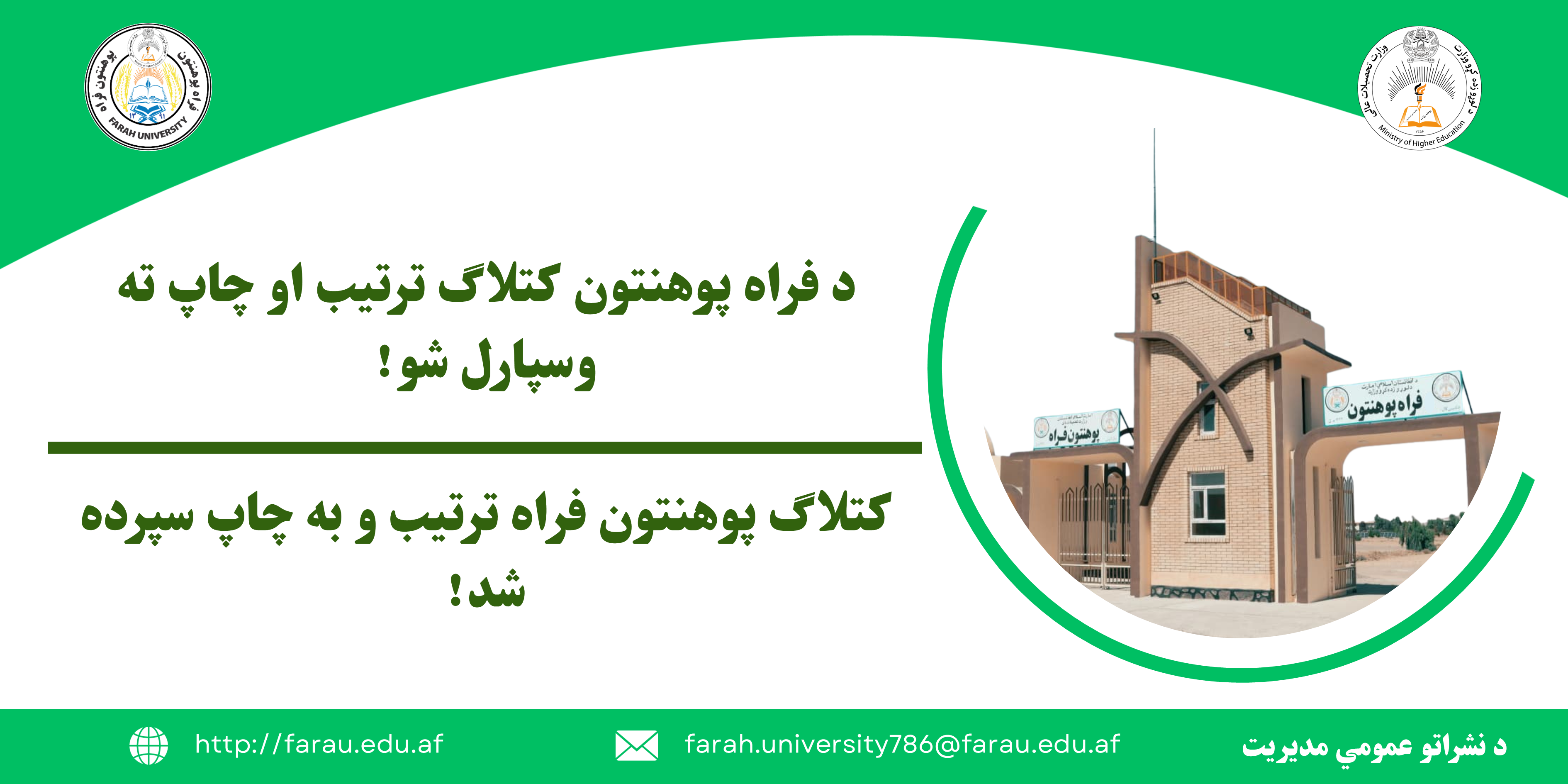 به منظور تحقق اهداف امارت اسلامی افغانستان جهت سپردن کار به اهل کار مؤسسهی تحصیلات عالی فراه به تعداد پنج (۵) بست خالی خویش را به اعلان رقابت آزاد میگذارد.